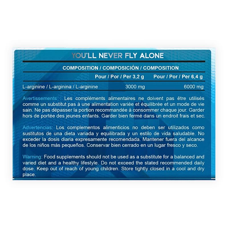 Se presenta en formato de polvo y contiene arginina, un aminoácido considerado condicionalmente esencial en situaciones de alto desgaste muscular o estrés metabólico. Además de participar en la síntesis de proteínas, también interviene en la formación de compuestos como el óxido nítrico y la creatina.