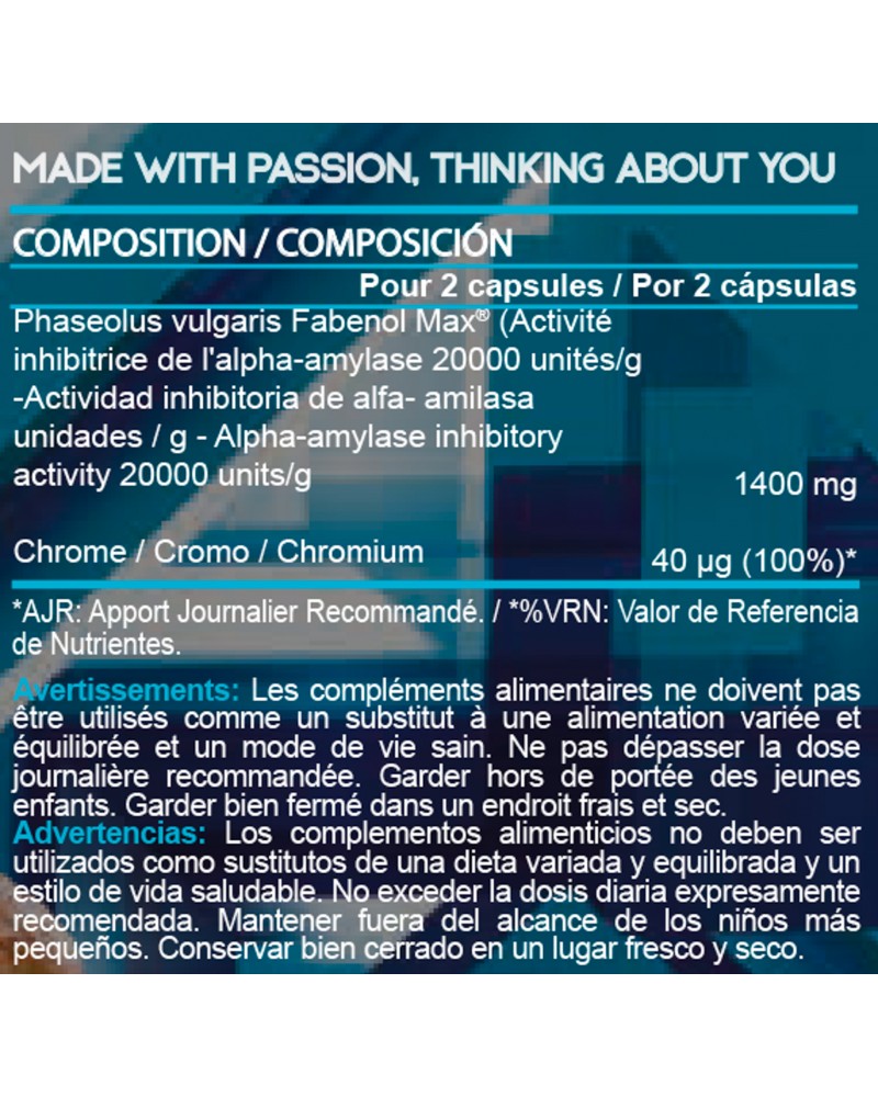 Fabenol Max® (extracte sec de mongeta (Phaseolus vulgaris L., 20000 Unitats inhibitòries), agents de recobriment (sulfits) (gelatina i colorants (carbonat càlcic i octenil succinat sòdic de midó)), antiaglomerant (estearat de magns crom.