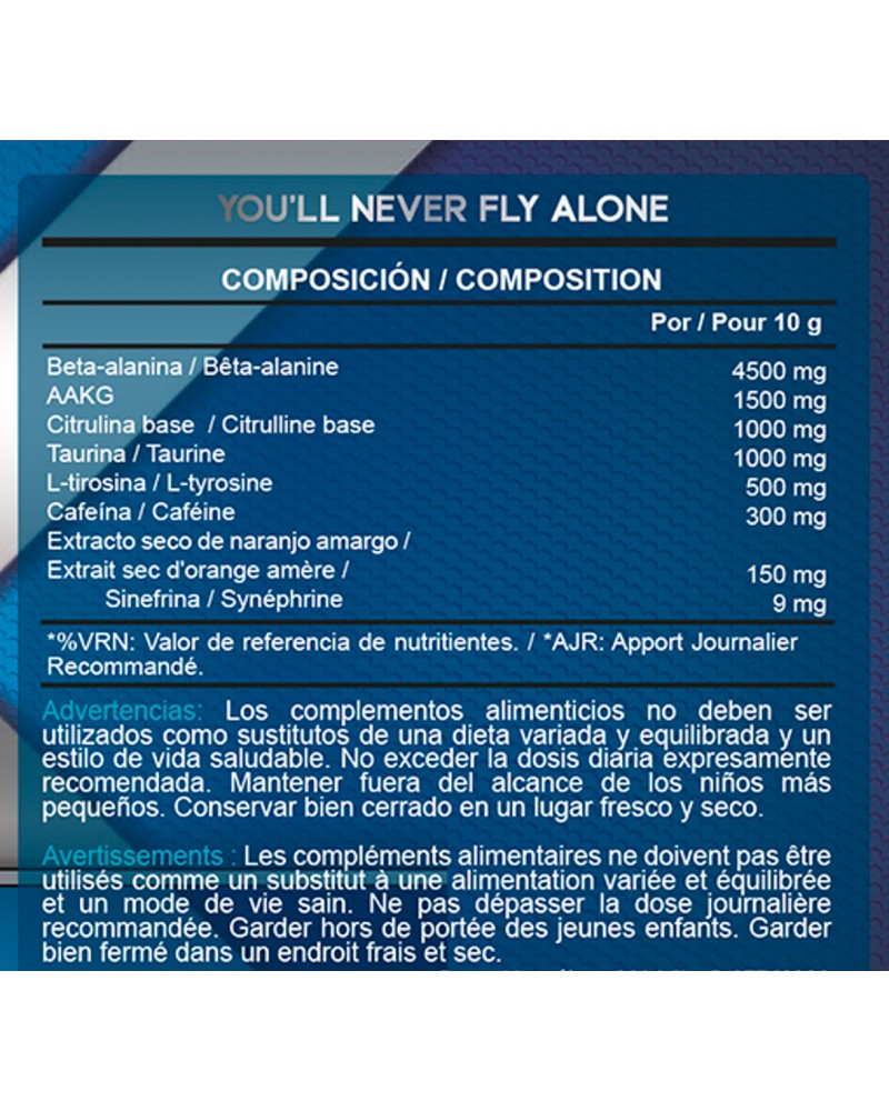 Beta alanine, L-arginine alpha-cétoglutarate (AAKG), citrullinebase, taurine, L-tyrosine, acidifiant (àcid citrique), caféine anhydre, arôme, antiagglomérant (dioxyde de silicium), extret sec d'orange amère. , 6% de synéphrine) et édulcorants (acésulfame K et sucralose).