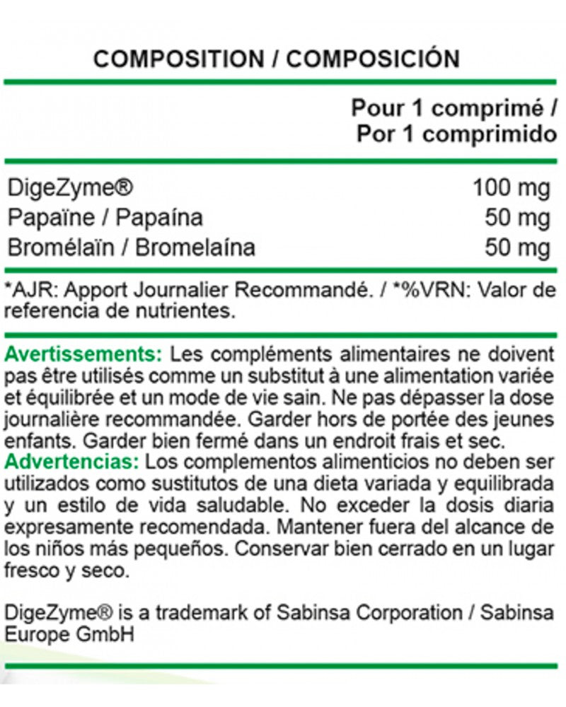 Maltodextrina, DigeZyme® (complejo multienzimático a base de amilasa, proteasa, lactasa, lipasa y celulasa), papaína y bromelaína.