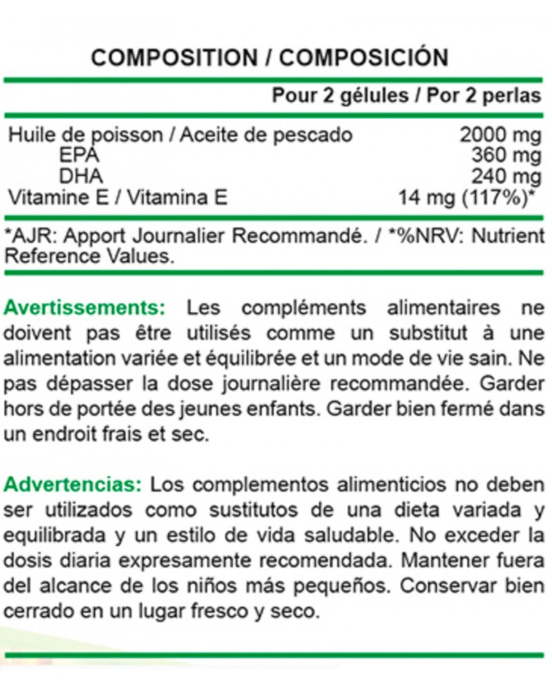 Aceite de pescado y vitamina E (acetato de DL-alfa-tocoferilo). Perla (gelatina, glicerina y agua).