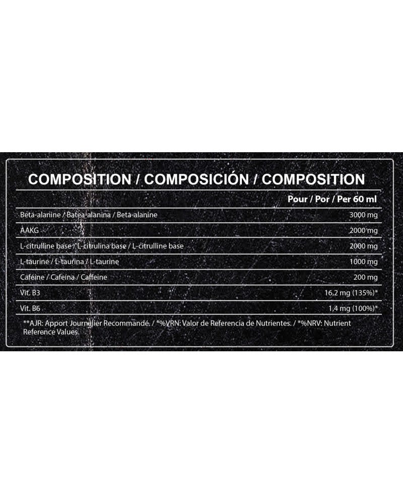 Agua, beta-alanina, L-arginina alfa cetoglutarato (AAKG), L-citrulina base, L-taurina, acidulante (ácido cítrico), aromas, edulcorante (sucralosa), cafeína anhidra, colorante (rojo remolacha), conservantes (benzoato sódico y sorbato potásico), vitamina B3 (nicotinamida) y vitamina B6 (clorhidrato de piridoxina). Contiene cafeína (200 mg por dosis diaria recomendada).