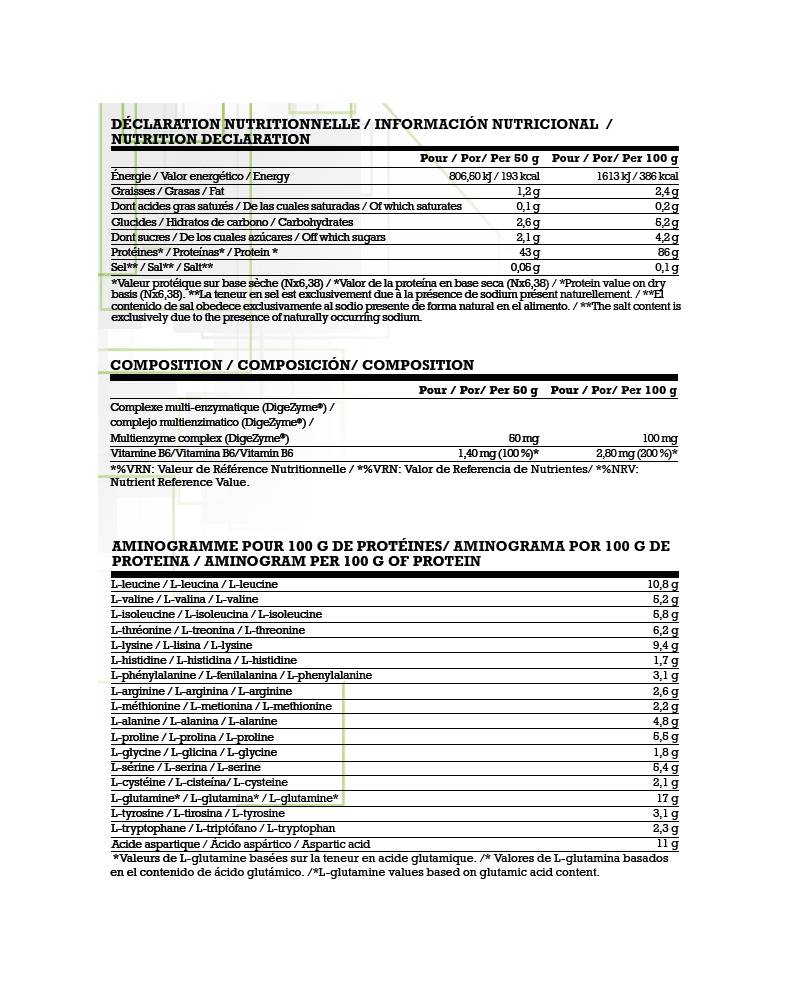 Mezcla de proteína de suero de leche (WPI 90 ISOLAC®) (contiene emulgente (lecitina de soja) y WPC 80 LACTOMIN®), L-glicina, maltodextrina, aromas, cloruro sódico y edulcorantes (sucralosa y acesulfamo K). Puede contener trazas de cacahuetes, frutos de cáscara, gluten (avena), huevos y pescado.